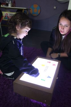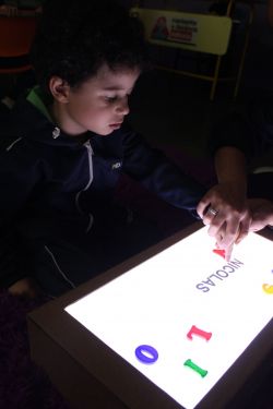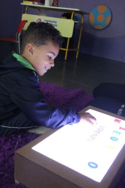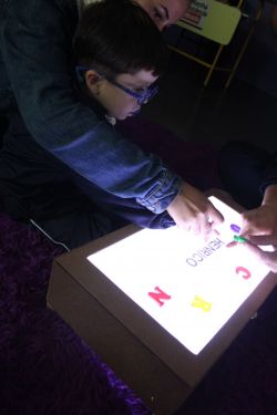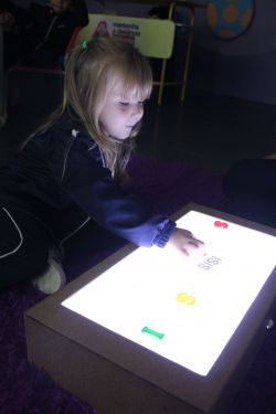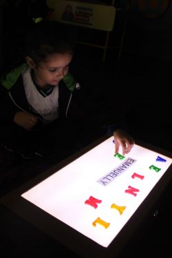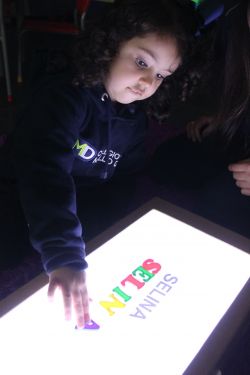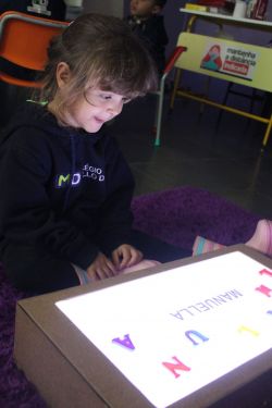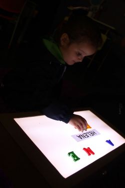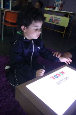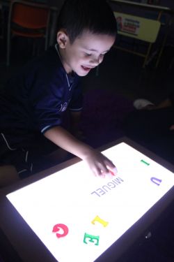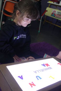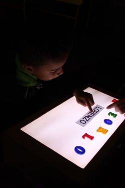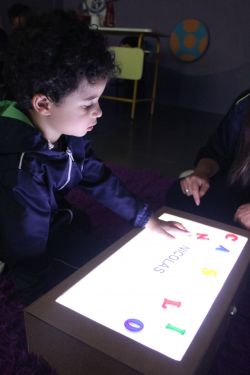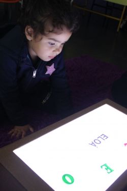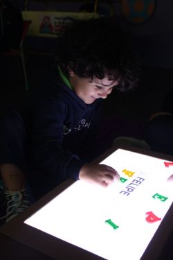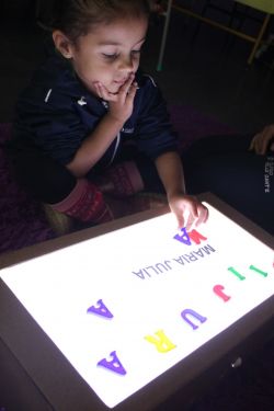 Identificando as letras na sopa de letrinhas, os alunos do Maternal reproduziram a escrita do nome próprio na caixa de luz. Além de exercitar a concentração de forma lúdica, a atividade trabalha à memória visual e o reconhecimento da criança no mundo.